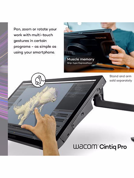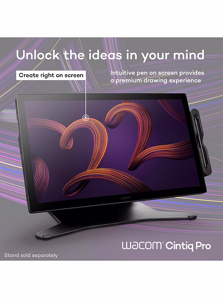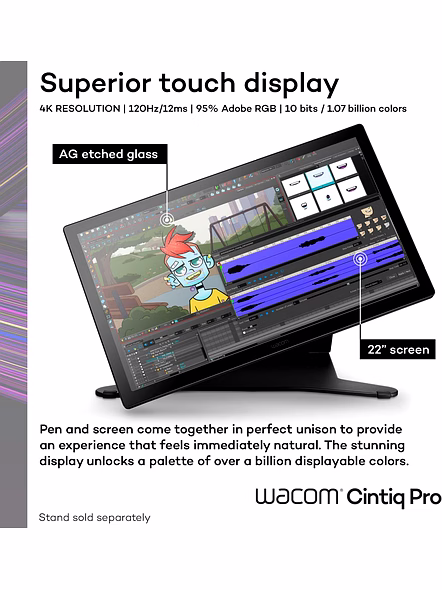 Wacom Cintiq Pro 22 drawing tablet is designed and engineered for professionals to create a harmonious creative process between artists and their work. Featuring a professional quality Ultra HD/4K display, along with Wacom’s Pro Pen 3, which matches performance with customizable comfort, every detail of Wacom Cintiq Pro 22 has been engineered for effortless harmony between creator and tool. The stunning display unlocks a palette of over a billion displayable colors. High coverage of Adobe RGB and DCI-P3 provide you with wider color gamuts and a larger breadth and depth of colors to work with. And this art tablet is Pantone™ Validated and Pantone SkinTone™ Validated to ensure that the color you see on screen is accurate and matches real-life skin tones. Say goodbye to the guesswork, as this graphics tablet arrives at your doorstep with factory-calibrated color accuracy and presets for Adobe RGB, sRGB, DCI-P3 and Rec. 709, EBU, Rec. 2020, PQ and HLG. In a world where clarity and motion unite seamlessly, our cutting-edge 120Hz screen refresh rate and fast response rate enable a near-zero display latency on this digital drawing tablet. Imagine creating film, game design and visual effects that make you feel like you're in the scene. Witness breathtakingly smooth transitions, crystal-clear details, and a level of realism that transports you to the heart of the action. Wacom Cintiq Pro 22’s touchscreen features 10-point multi-touch, which enables you to interact with your content simultaneously with your fingers as well as the pen on screen. Use natural gestures like panning, zooming, and rotating to enjoy a completely immersive experience in your creative process. Stay in the flow with eight ExpressKeys™ on the rear grip, ready to customize to your favorite keyboard shortcuts. The Pro Pen 3 features 8192 levels of pressure sensitivity. It also offers complete customization of your pen experience with three programmable side switches, interchangeable grips, and the ability to adjust the pen's weight and center of balance to suit your style. The Cintiq Pro 22 graphics tablet is designed with convenience in mind. It features four standard ¼ inch screw threads integrated into the display bezel, allowing you to attach mounts for your phone or camera. For added functionality, consider the optional Wacom Extension Table (sold separately), providing a convenient surface for your keyboard or reference materials right within reach. Plus, the included pen tray attaches to the display and makes sure all your nibs and grips are close at hand, whenever you need them. Because Wacom’s products are standard tools across the Media and Entertainment industry, Wacom Cintiq Pro (and all of our professional products) are supported for easy integration into your studio or professional workflow and are compatible with all modern Linux distributions for local and virtualized systems. Find the right angle with a variety of stand options. Add a 100x100 mm VESA arm or the Wacom Cintiq Pro 22 Stand (ACK64802KZ) and bring maximum comfort to any workspace. The Wacom Cintiq Pro 22 stand adds flexibility and stability and allows for rapid adjustment of the height, angle, and up to 20 degrees of rotation in each direction. Stand and arms are sold separately.